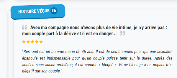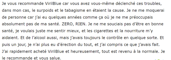 Nous avons d’un côté ceux qui sont très satisfaits, et qui sont parvenus à améliorer leur sexualité en suivant une cure de VirilBlue. Ils témoignent du changement majeur que cela a représenté dans leur vie et insistent sur le fait que le complément alimentaire sera efficace si vous vous reprenez en main complètement.
